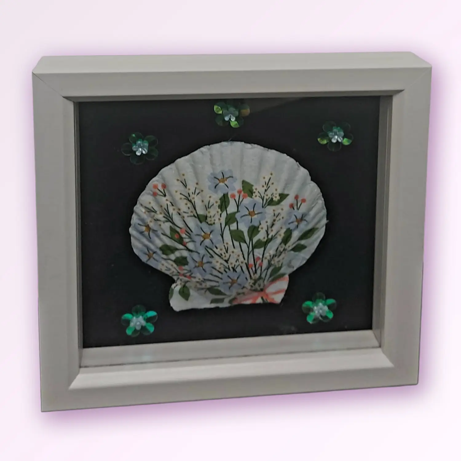 A framed Scallop Shell featuring a decorative ginkgo leaf design.
