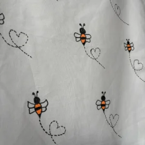 A delightful hand-painted tea towel featuring charming bees flying across the fabric, each leaving a dotted heart-shaped trail behind them. The whimsical design combines nature and sweetness with bees in orange and black creating a cheerful, repeating pattern. Perfect for bee lovers, gardeners, or anyone who appreciates nature-inspired kitchen decor. Machine washable cotton. Size: standard tea towel.